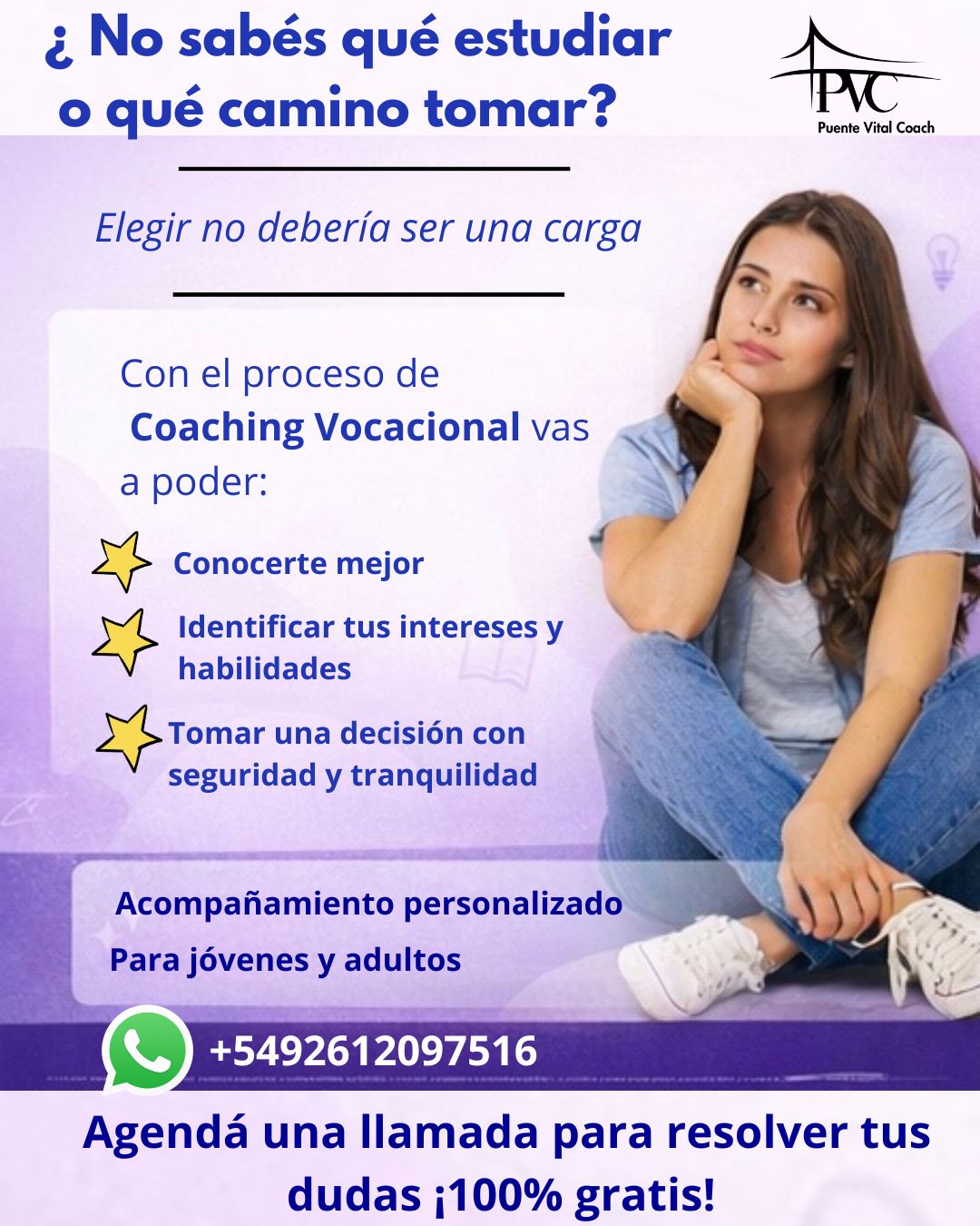 📖 Proceso de coaching vocacional, a través de un programa de acompañamiento personalizado, diseñado para brindar claridad, seguridad y propósito a los afiliados y su grupo familiar en momentos de transición educativa y laboral.